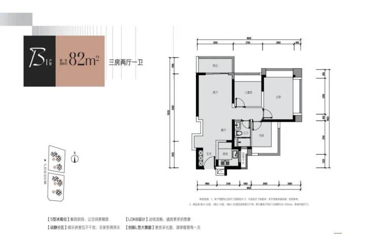 82㎡的3房2厅1卫(户型B),设计的是经典竖厅格局,进门入户玄关,客厅3.3米开间,LDKB一体化设计,动静分区,3个卧室分别做到了3.5米/2.7米/2.55米的宽度,主卧加1个次卧270°飘窗设计,U型厨房,得房率:77.5%(不含赠送),全部东北朝向。