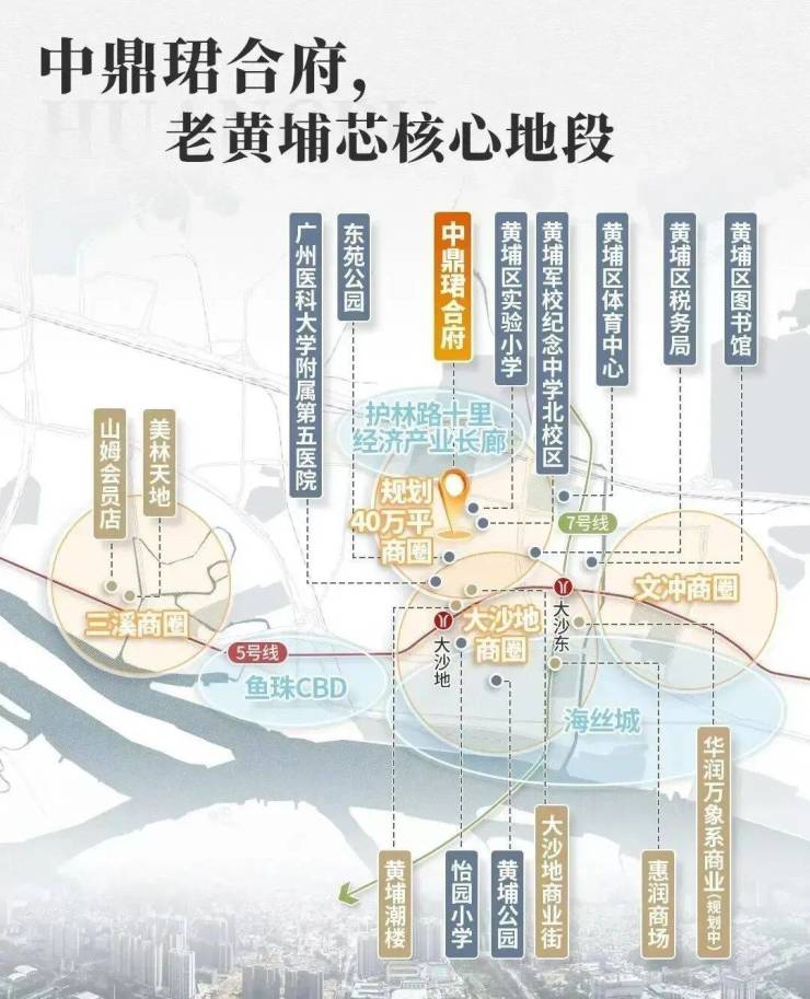中鼎珺合府所在的大沙地,是老黄埔中心区域内发展更成熟,环境更宜居、商业更发达、医疗教育更优质、交通更快捷的板块。自身也是建面约280万㎡的文化生活大城,集文化中心、商业中心、教育中心、居住中心于一体。配套40万㎡的商业配套,涵盖了五星级酒店、超甲级写字楼、商办物业、商业步行街、大型商业MALL等。