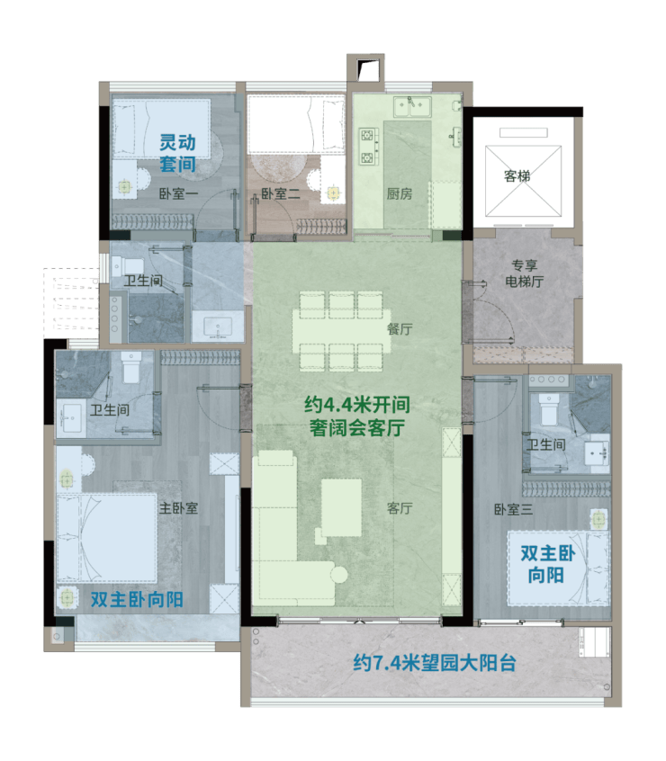 约7.4米奢阔大阳台揽山望园,双套房设计满足三代同堂家庭对独立空间与亲密共处的双重需求,主卧步入式衣帽间提升生活品质,是精英家庭理想之选。