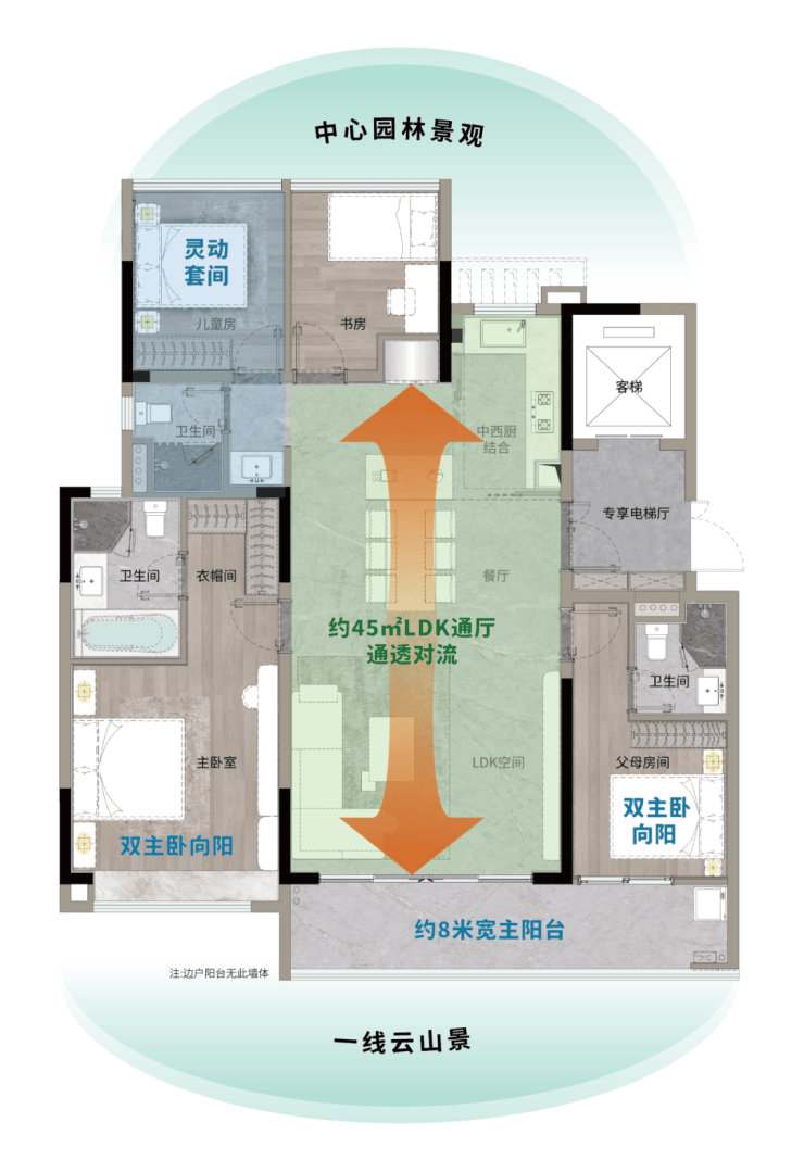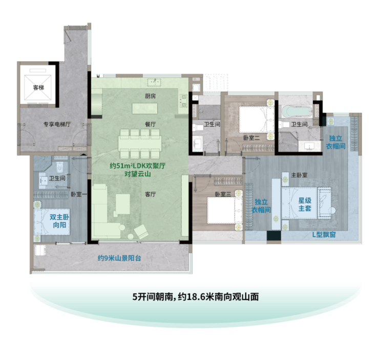 奢享约18.5米总开间,五开间向阳。约50㎡LDK一体化空间,搭配中西双厨,尽显风范;星级主套房配备双独立衣帽间及270°全景飘窗,尽览云山盛景,是追求多代同堂和乐生活的塔尖家庭优选。