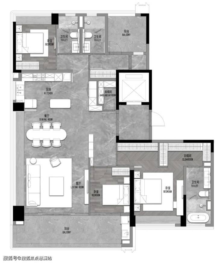 户型融合全角厅设计,大进深阳台,LDKRG一体化空间,公区多重洄游动线等设计,以独立西厨中岛建立洄游动线,打造真正意义的社交餐厨;打造佛山首个观景阳台进深大于2.1m的大阳台,创造空中大庭院的空间,实现墅居式大平层生活。