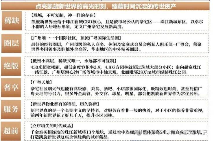 凯旋新世界呈现出的⼴粤国际⽣活圈,是⼀个都市化的国际社区⽣活中⼼,项目集高档品质住宅—「枫丹丽舍」、「广粤观邸」、「广粤尊府」,国际时尚商圈—「广粤天地」,酒店式服务公寓—「广粤公馆」,以及华南顶级社交平台—「广粤会」为一体,是珠江新城最具生活氛围的社区,吸引着多国驻广州领事以及驻穗外企高管于此居住,广粤会会籍已价值22万/个。