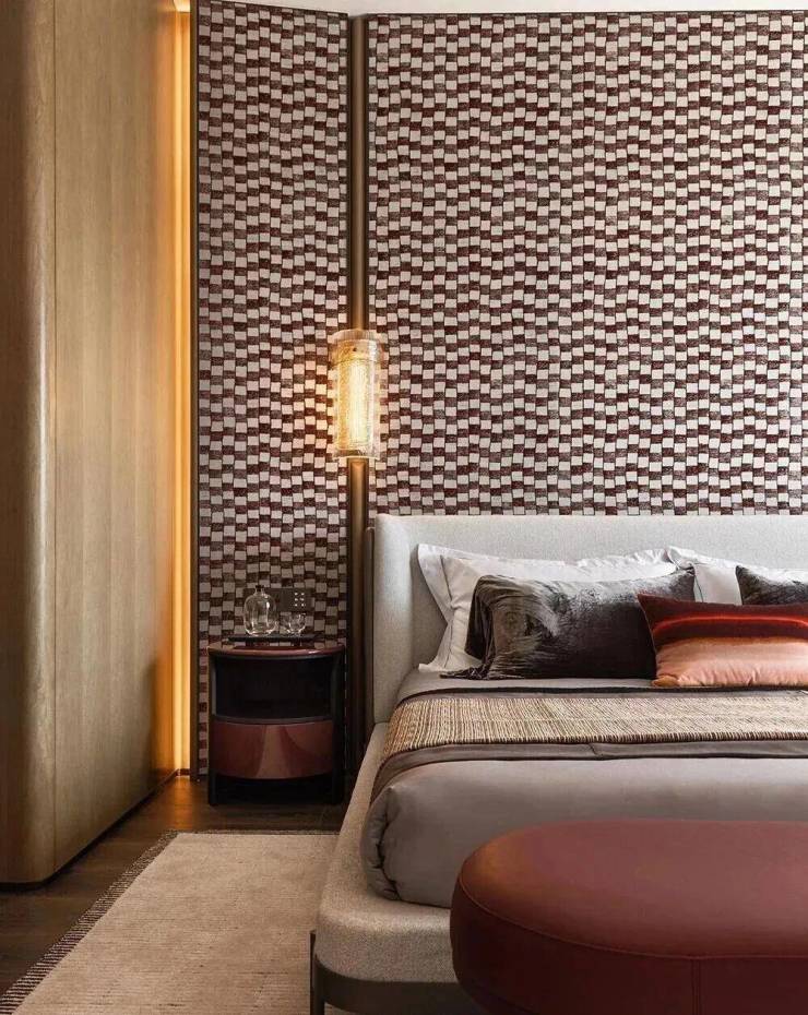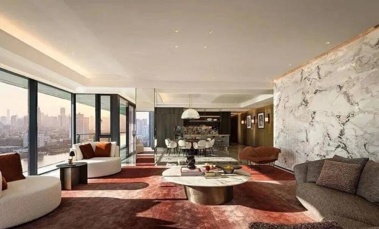 以“四房两厅四卫”布局,三面环江,270°环幕江景与客厅波浪肌理墙面相呼应。主卧采用米白与原木色基底,红白格纹艺术墙纸与红色床凳点亮空间;浴室面向江景,宝格丽红奢石彰显尊贵。以L形露台为特色,超30米露台串联客餐厅,形成“江景会客厅”。阿凡达绿奢石电视墙划分空间边界,开放式中西厨与双餐厅设计,让烹饪成为家庭互动核心。