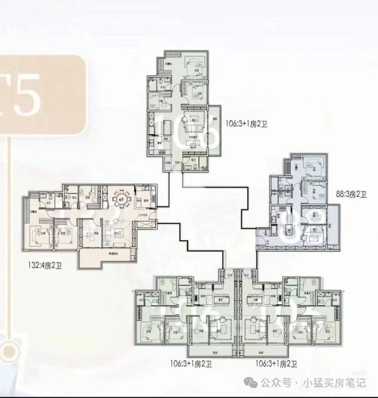 本次首开的2T5楼栋打造三大主力户型,精准适配不同置业需求。132㎡4房2卫堪称户型王,南北通透双阳台设计,客厅次卧连通大阳台,主卧套间带独立衣帽间,三代同堂或二胎家庭皆适配;106㎡3+1房2卫为刚改爆款,灵动空间可随心改造,楼下双拼户型楼间距更宽,私密性拉满;88㎡3房2卫是刚需福音,三开间朝南,中间户也优化了通风采光,空间利用率拉满无浪费。