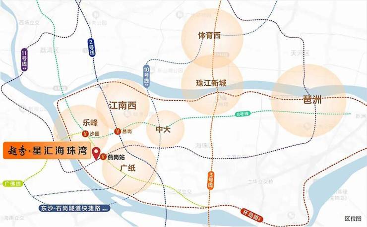 项目交通极为便利,双地铁加持,11 号线(在建中)经过项目,距广佛线燕岗站约 450 米,接入 3 号线后 7 站即可到达珠江新城。同时,海珠环岛路(在建)工程进度不断刷新,未来价值即将兑现。便捷的交通网络,串联起城市的财富动脉,让您轻松畅达城市各处。
