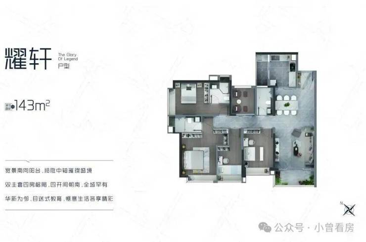 143㎡四房是改善型主力户型,总价 880 万元 / 套起,做到了双主套设计,主卧带步入式衣帽间和独立卫浴,长辈房也配备了私卫,避免了家人共用卫生间的尴尬,客厅开间 4.5 米,南北双阳台对流,北阳台看社区园林,南阳台能眺望远处景观,每个房间的窗地比都比较高,正午时分不用开灯也很明亮。