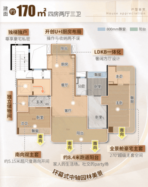 170㎡四房两厅三卫更适合多人口家庭,主卧升级为豪华套房,配备独立卫浴和步入式衣帽间,私密性和舒适度都更优,双卫设计避免了早晚高峰的使用冲突。