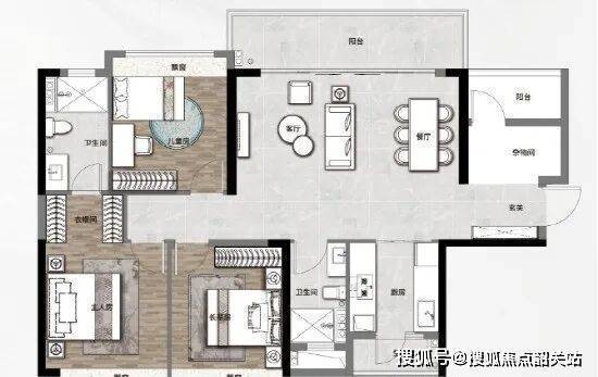 125㎡四房两厅两卫:正南北横厅户型,客餐厅一体,双阳台南北对流,通风和采光效果极佳。