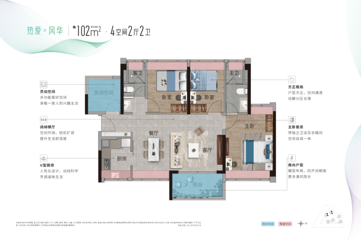 入户玄关、U型厨房、客餐厨三连厅、多功能灵动空间、卧室大飘窗等标配,这个户型通通都有,主客卫设计,相当新颖。