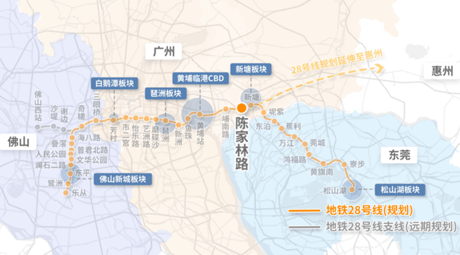 还有规划中的28号线的陈家林路站,距离项目大概只有900米左右,目前规划站点在合生湖山国际那边,但还是存在一定的不确定性,地铁建好开通以后,坐地铁去天河、海珠、黄埔等区也非常方便。