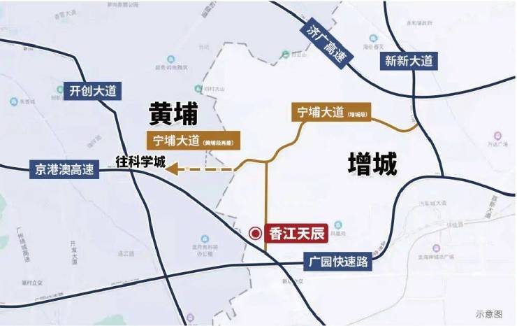 交通方面,自驾比较方便,可以通过广深高速、广园快速、广深大道,快速通达黄埔、科学城、天河等中心区,特别对科学城白领来讲,出门不远就是已经局部通车的宁埔大道(预计2024年底会全线开通),双向六车道为你的畅通出行保驾护航,未来,只要一首歌的时间,就可以从这里自驾到科学城,一集新闻联播的时间,更是可以到金融城、珠江新城等核心区域,自驾出行还算便捷。