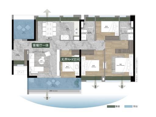 项目所有户型全南向设计,100㎡以上户型均做到南北对流、四开间朝南,日均日照时长可达 7-8 小时。搭配约 6 米超大观景阳台,室内空间通透开阔,阳光与清风全天候相伴。