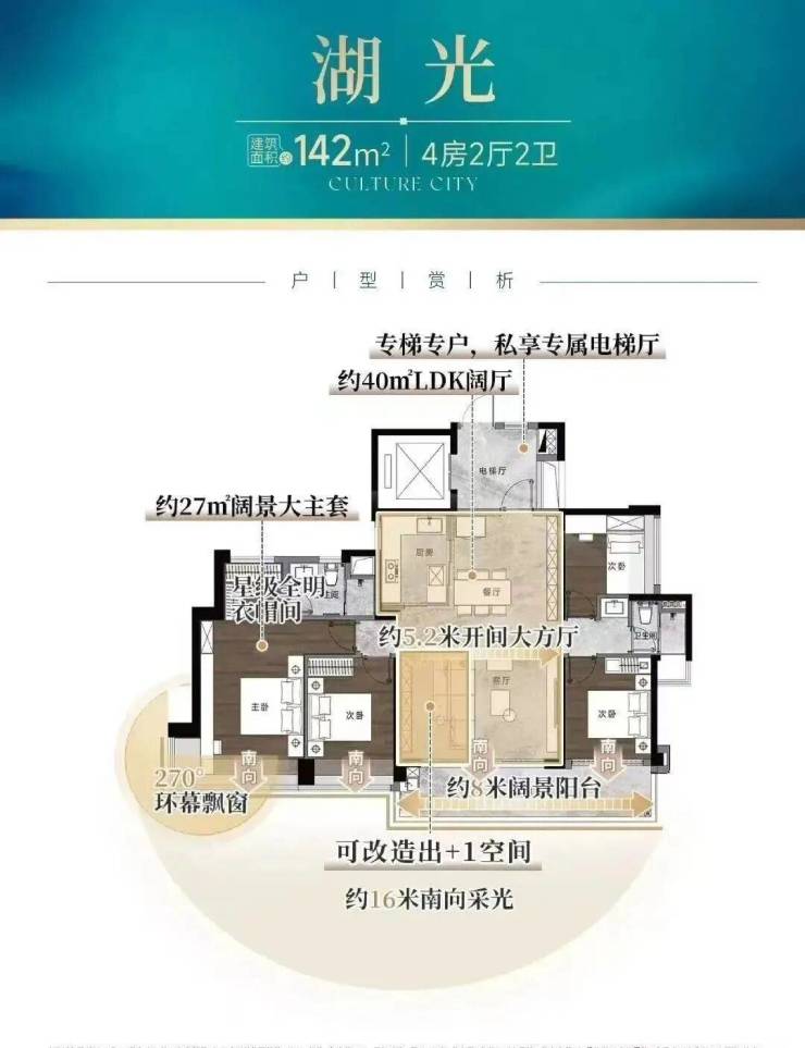建面约142㎡的四房,做到约16米南向采光,站在约8米全景阳台,约1.2万㎡湖景扑面而来,高层还能望江。