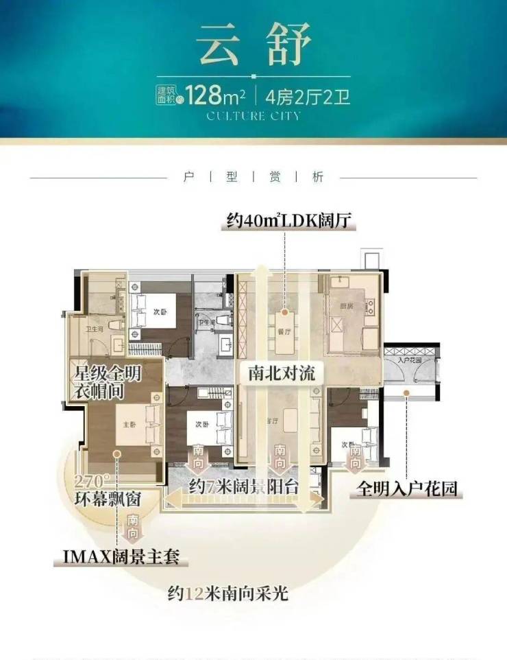 建面约128㎡的四房,则做到约16米南向采光、南北对流,且拥有一个约40㎡LDK阔厅,碾压市场同面积产品。