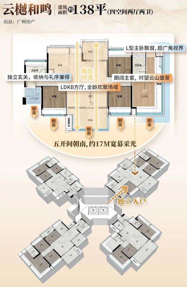 产品主打100-138㎡新规四房,使用率超100%,采用LDKG一体化方厅设计,南向双阳台搭配灵动空间,适配全生命周期需求。社区容积率3.0,2梯4户布局,“一”字横向分布实现无遮挡采光,萃取白云山元素打造“四幕九境”园林,配备双层泛会所,细节尽显精工质感,适配多代同堂改善家庭。
