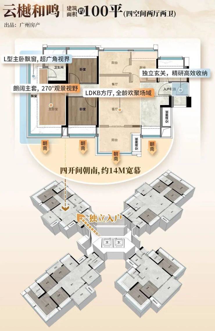 户型亮点:主打约 100-138㎡全南向四房,主力户型四开间朝南,南北双阳台,主卧 270° 飘窗,全屋 “800 库” 收纳系统,LDKB 一体化方厅提升空间利用率。