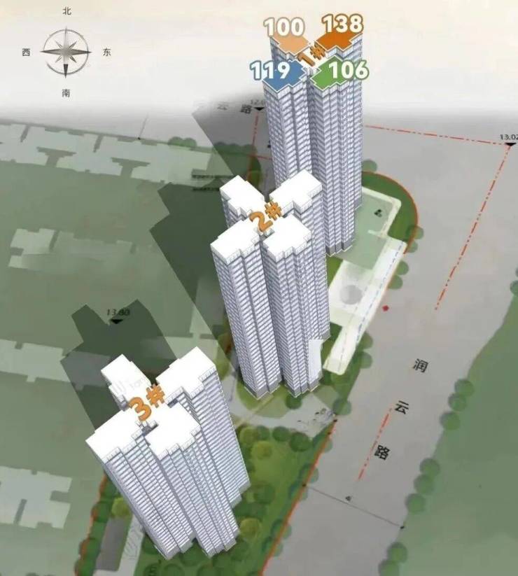 布局特点:3 栋塔楼一字排开,东南向无遮挡,高层可远眺白云山,每户采光与视野均衡,无明显遮挡。