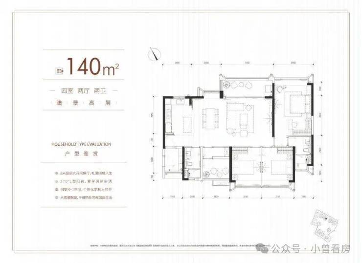另外还有140㎡的四房户型,采用横厅设计,南北对流,北向主阳台望公园,南向卧室飘窗看小区园林,只是目前剩余房源已经不多,价格也相对更高一些。
