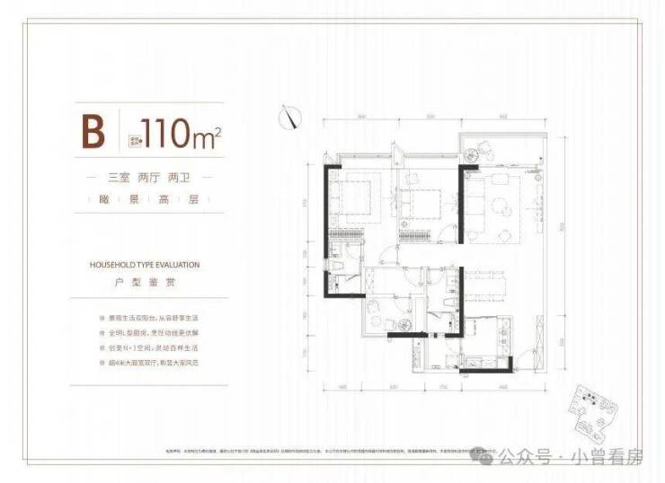 其中 B 户型带景观和生活双阳台,厨房是全明 L 型设计,客厅面宽达到 4 米,空间显得通透;