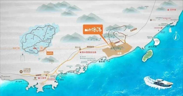 项目位于陵水黎族自治县香水湾旅游度假区牛岭隧道位置,陵水与万宁的交界处,一线海景区,前瞰陵水香水湾、万宁日月湾,背倚牛岭山脉。项目位于北纬18度,年平均气温26度,是最适宜旅游度假的气候条件;牛岭是热带与亚热带交汇处,依山面海, 区域南北气候大异,在这里常常可以看到奇观异象,海南俗语也有说牛头下雨牛尾晒正是形容此处。岭北大雨滂沱岭南阳光明媚,气候条件是海口及三亚无法比拟的。