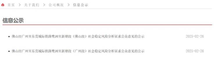 广州地铁官网发布了佛穗莞城际广州段、佛山段的社会稳定风险分析征求公众意见的公示。