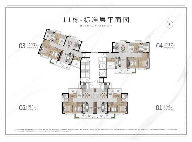 以山景为依托,半围合式布局,每一栋高层朝向皆不同,前后无遮挡,每一户的景色都是独一无二。