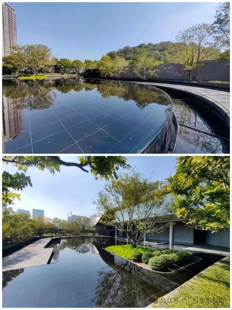 润府园林,有种穿梭在岭南山水之间的感觉,树种和落客区相呼应,听说以后都会移植到小区内部,水景地面的黑金沙石材,让水面显得格外清澈,能清楚看见倒映的树、山和天空。