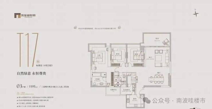 有172㎡、195㎡等多种面积。其中,172㎡的三房分布在t10、t26栋的3-9层,2梯3-4户,有三房两卫;195㎡的三房在t17栋的3-26层,2梯4户,有三房两卫。LDKB 一体化会客厅,朋友聚会超有面儿。
