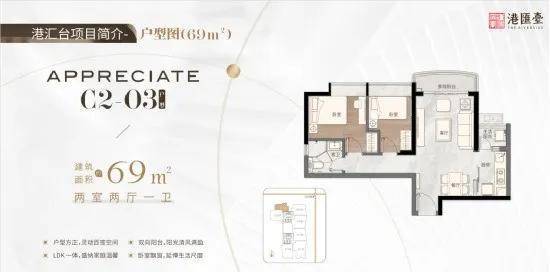 69㎡双阳台两房两厅一卫,户型方正,灵动百变空间,LDK一体,盛纳家庭温馨,双向阳台,阳光清风,视野开阔,全飘窗设计,增加室内利用空间