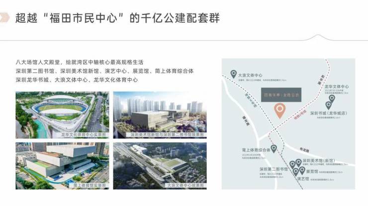 周边涵盖深圳美术馆新馆(试运行)与深圳市第二图书馆(已开放)两大深圳新十大文化地标;近享深圳文化馆新馆(在建中)、简上体育综合体、深圳书城(龙华城)等市级文体项目,打造10分钟文体服务圈,构建对标世界的艺术文化生活区。