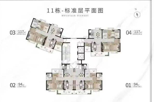 户型设计:高层洋房组团【望岳】采用半围合设计,前后无遮挡,最大超 1000 米楼间距,2 梯 4 户布局,带来墅质空间体验。94㎡纯南向 N + 1 百变三房,客厅开间 3.6 米,约 6 米阔景阳台,三开间朝南;117㎡墅级尺度创新 n + 1 四房,双观景阳台,约 6.2 米阔景阳台,正南北通户型,四房开间朝阳。两种户型均配备豪宅交标,全屋赠送中央空调。