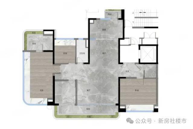 • 120㎡四房两卫:南北双阳台,4.9米面宽客厅,主卧270°飘窗,独立电梯厅,实用率高达120%。