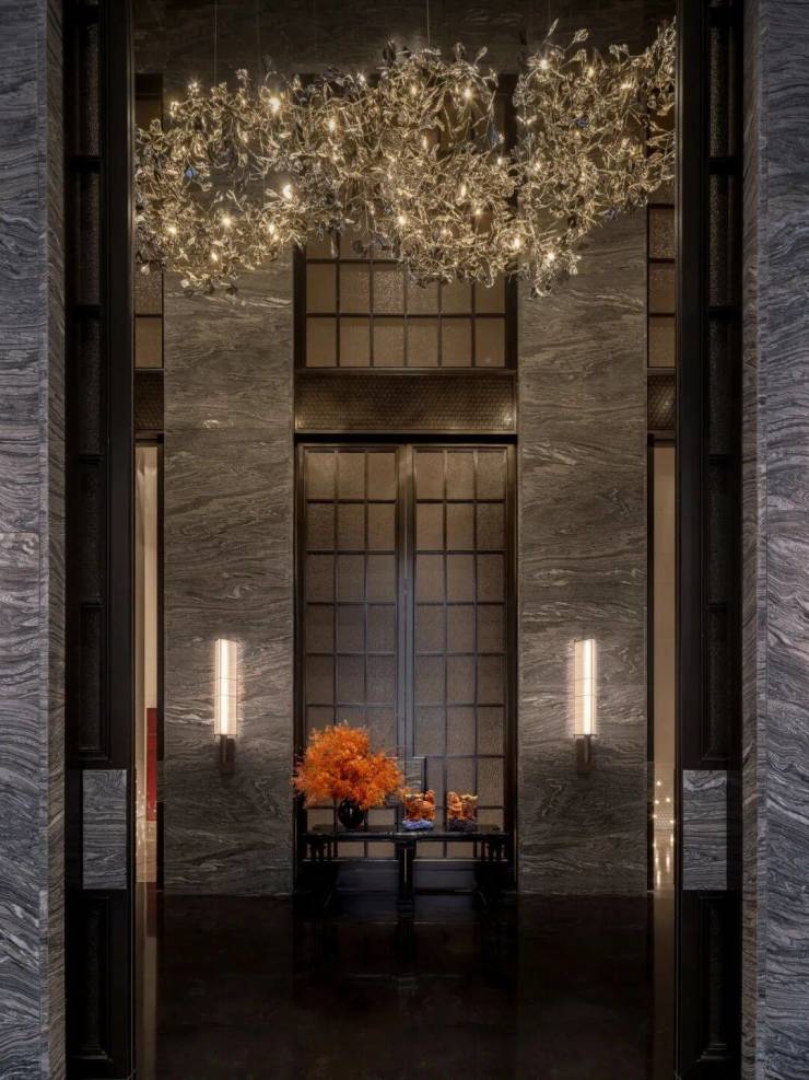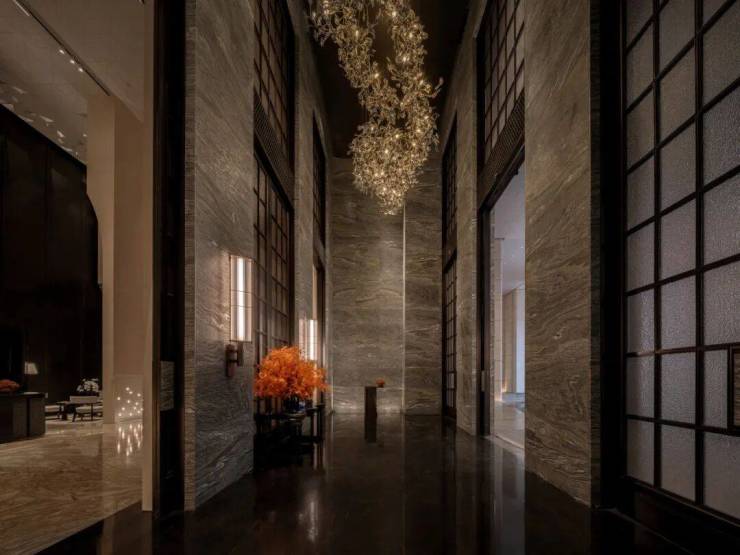 富有流动感的“水云纱”石材与通高的落地金属格子玻璃长窗玻璃勾勒出二、三进立面的对称格局。门边两侧各缀一盏暖色壁灯,门前摆放着一捧怒放的大红色鲜花,这些细碎的温暖,正是归家时最动人的仪式感。