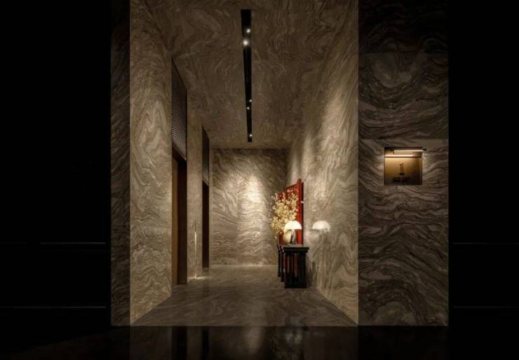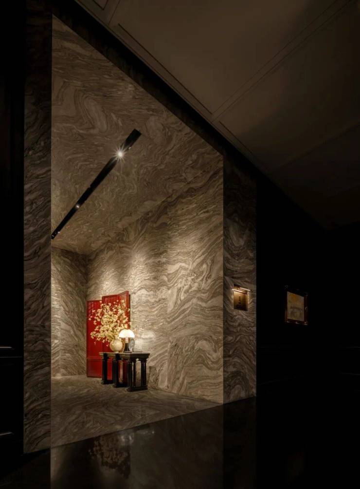 电梯厅内,天然石材经由简练的几何构成,奠定了空间纯粹且富于现代感的基调。局部光影与艺术陈设作为点睛之笔,让这份简约在不经意间流露出细腻的层次。这些墙面装饰,均由石材经深浅不一的浅浮雕制成,在近人尺度观看时犹显奢华姿态。