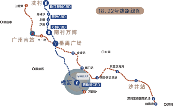 换乘:1站可换乘22号线,快速通达东莞、深圳;18号线南延段预计2025年建成通车,届时可直达中山、珠海,进一步完善湾区交通路网。