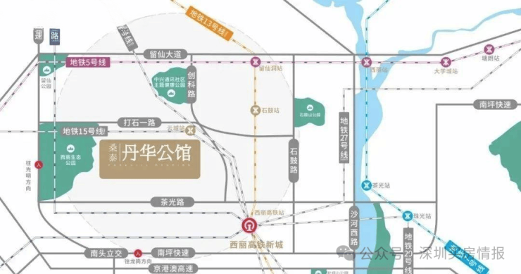 紧邻西丽高铁站,4高铁+2城际1小时捷达湾区生活圈,6地铁(5号/7号/13号(在建)/15号(在建)/27号(在建)/29号(在建))通达全城