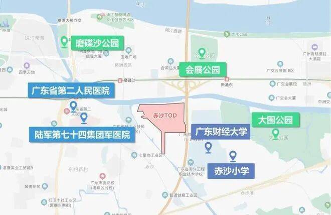 越秀琶洲南TOD项目位广东省广州市海珠区金运路1号,海珠赤沙TOD地块东侧紧挨华南快速干线,北侧隔着黄埔涌,对岸就是高楼林立的电商总部琶洲西区。