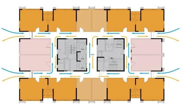 项目摒弃传统单过道,项目采用双环通走廊,极大提升通风采光。