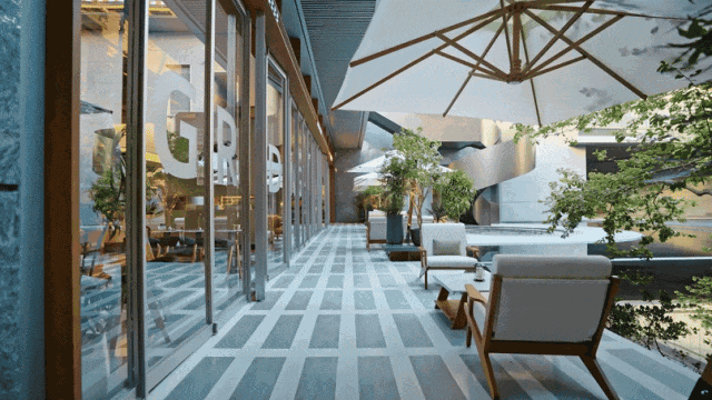 园林深处,玻璃盒子造型的营销中心跃入眼帘,S形曲线结合金属与玻璃立面,艺术感十足。