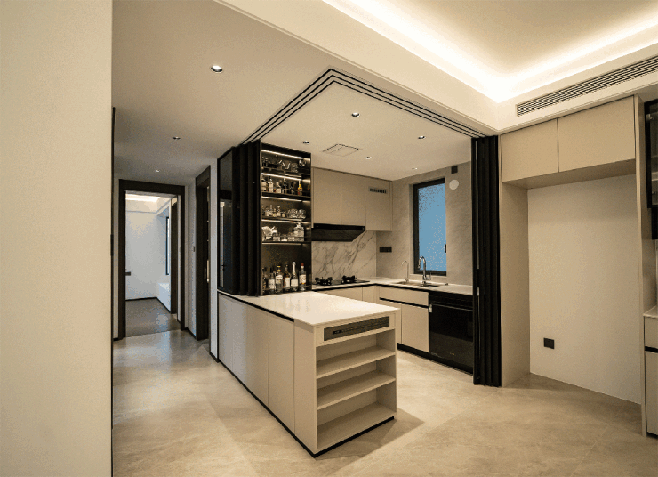 洗菜区正对餐客厅,备菜时也能与家人互动,增进家庭氛围。细节上,岛台加宽提升实用性,移门滑轨隐藏于天花,整洁美观。
