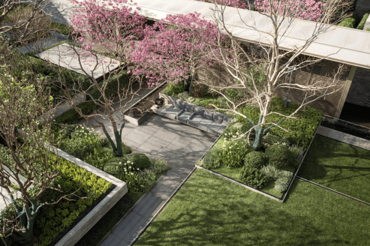 为了给业主尊贵的归家礼序,白鹅潭悦府的社区规划与归家场景结合江景资源,特别营造悦心归家庭院,将广府气韵与矜贵树种交融。