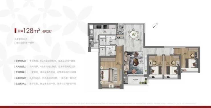 建面128平四房两卫,五开间朝南,客厅直出阳台,四个卧室非阳台报建,收楼后不用自己改造,总价510万左右。