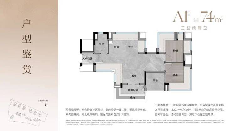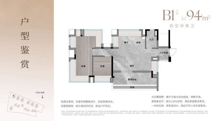 约74-94㎡三至四房,2梯4户设计,四面宽朝南,大方厅设计,小家也有大精彩。