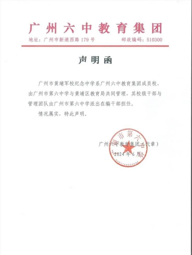 2024年4月30日,中鼎珺合府官宣广州市第六中学教育集团(黄埔军校纪念中学)进驻项目,该学校是广州市第六中学管理和办学的公立学校,根据黄埔区教育局招生计划,9月1日开学。