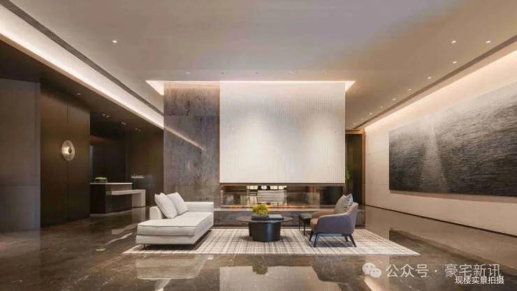顶奢酒店式入户大堂,石材铺装,打造尊崇的三重归家礼序,开敞阔绰奢豪,点缀多元艺术美陈。