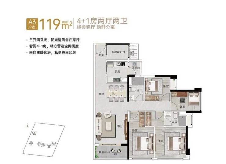 【119㎡4+1房2厅2卫】单边位布局,15米南向开间,南北通透