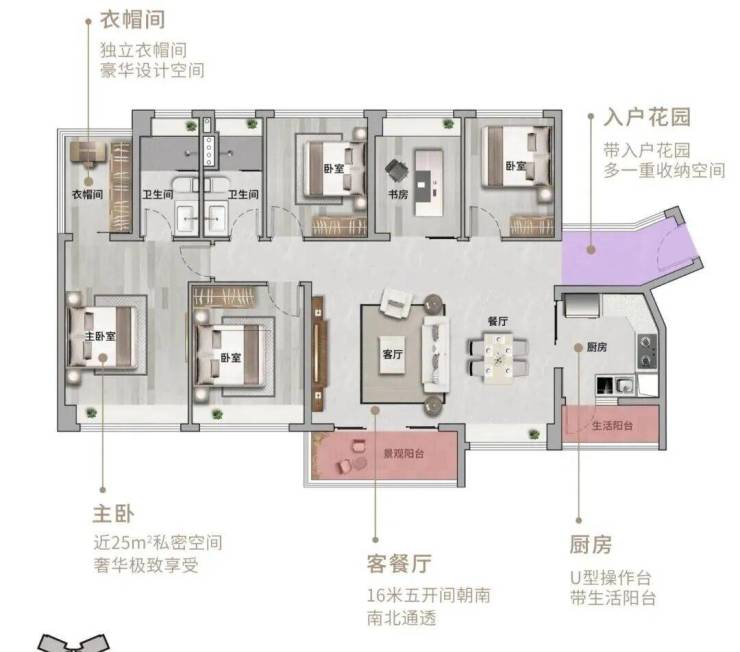【140㎡5房2厅2卫】南北对流,约32m²阔绰客餐厅,约16米南向五开间,享央景园林约25m²豪华主卧,带独立衣帽间。