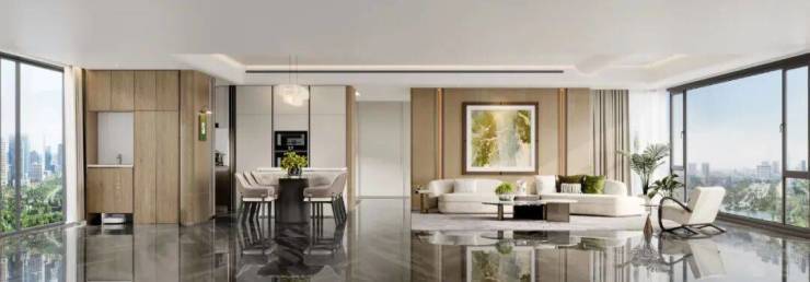 约13米南向采光面,也是观园面,自客厅贯穿主次卧,直望约1.3万平中央园林。
