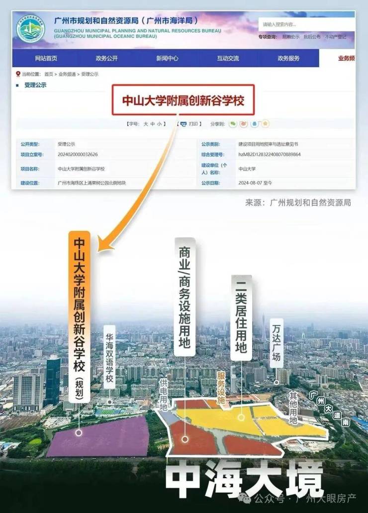 项目地块西侧规划了15年的教育资源地块,由政府引进中大附中办学(一个托儿所、一个6班幼儿园、一个18班小学和一个72班完全中学),要建成广州市综合排名前5的学校。
