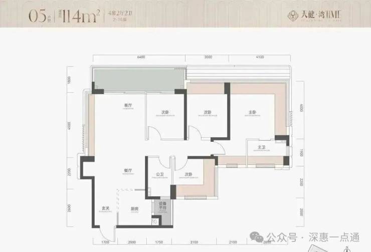 114㎡的4房2厅2卫,设计的是竖厅格局,客厅3.7米开间,LDKB一体化,客厅双面采光,凹墙设计预留冰箱卡槽位,动静分区,分别做到了主卧20.39㎡/次卧12㎡/次卧9.3㎡/次卧8.64㎡(包含墙体飘窗),L型厨房还带1个设备平台约2.86㎡,卫生间干湿分离,得房率约81%(不含赠送),客厅连接次卧出6.4米长的大阳台约11.52㎡,东北朝向。套内面积92.34㎡+飘窗17.25㎡+阳台5.76㎡+设备平台2.86㎡=实得面积118.21㎡,加上赠送后得房率约103.69%。